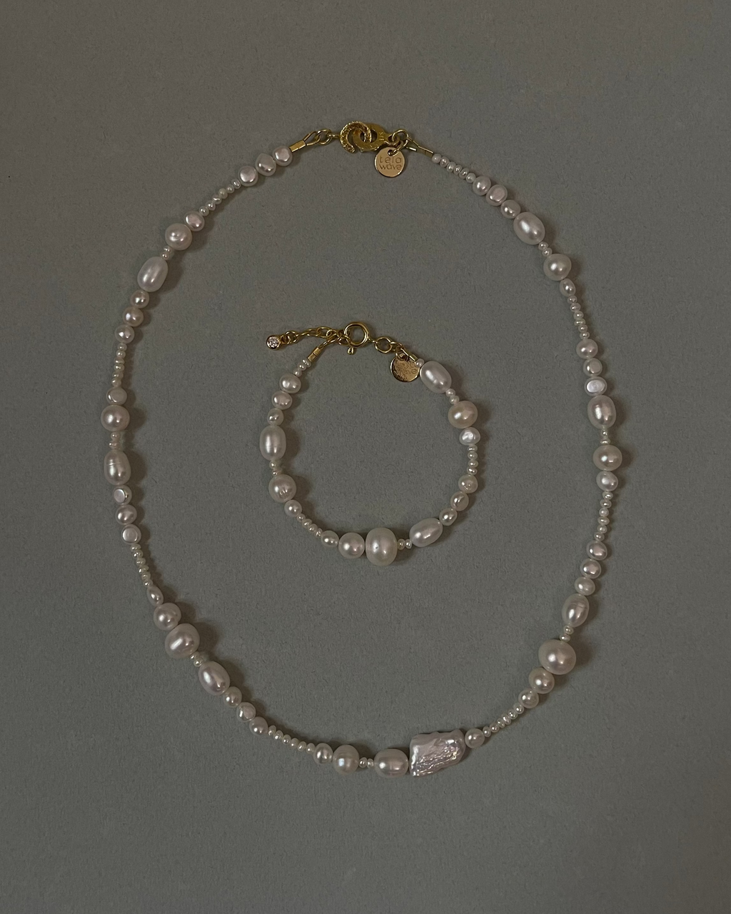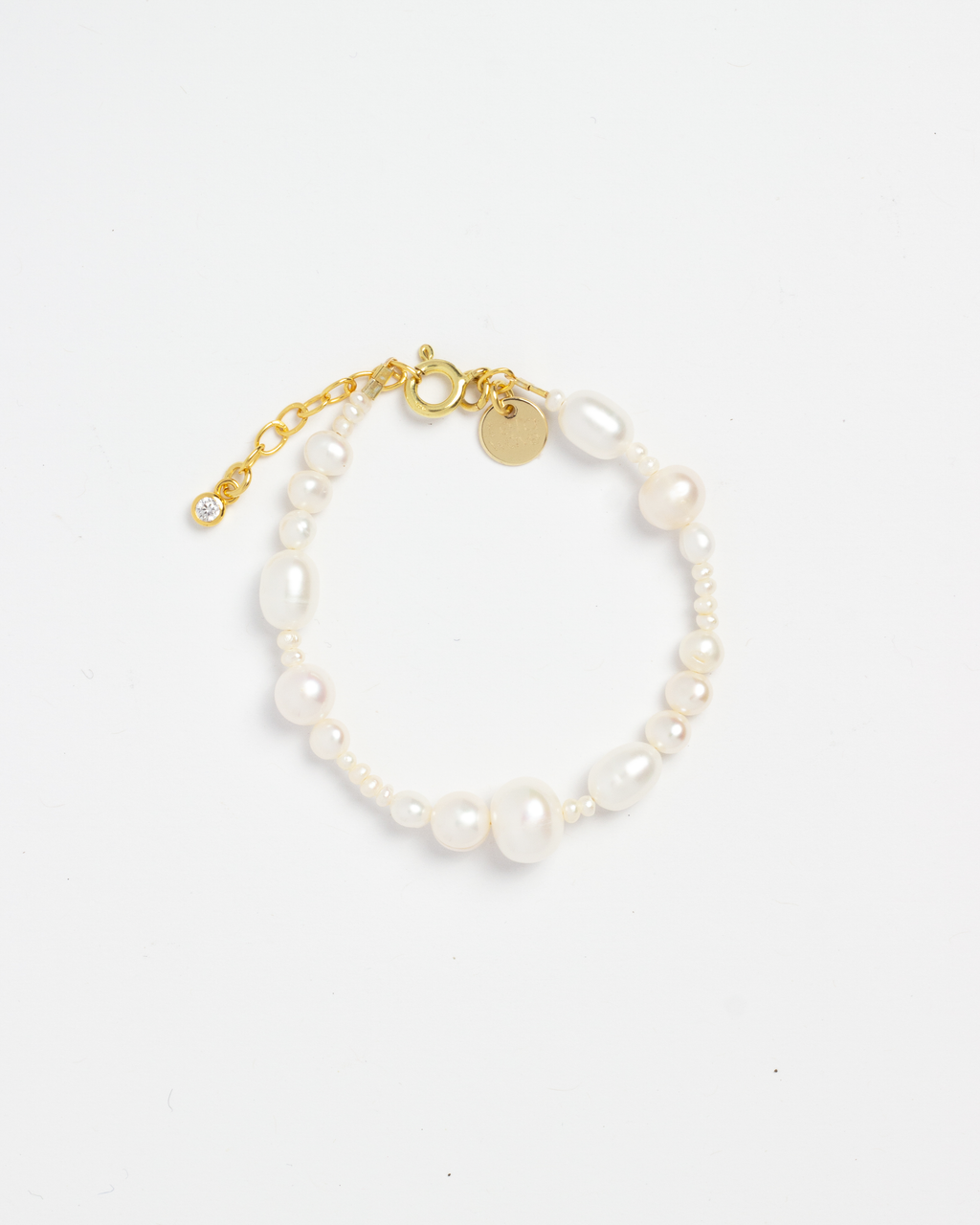 Our AVA bracelet is a unique and timeless piece made with irregularly shaped freshwater pearls in various sizes and finished with a crystal charm, that adds a little sparkle.