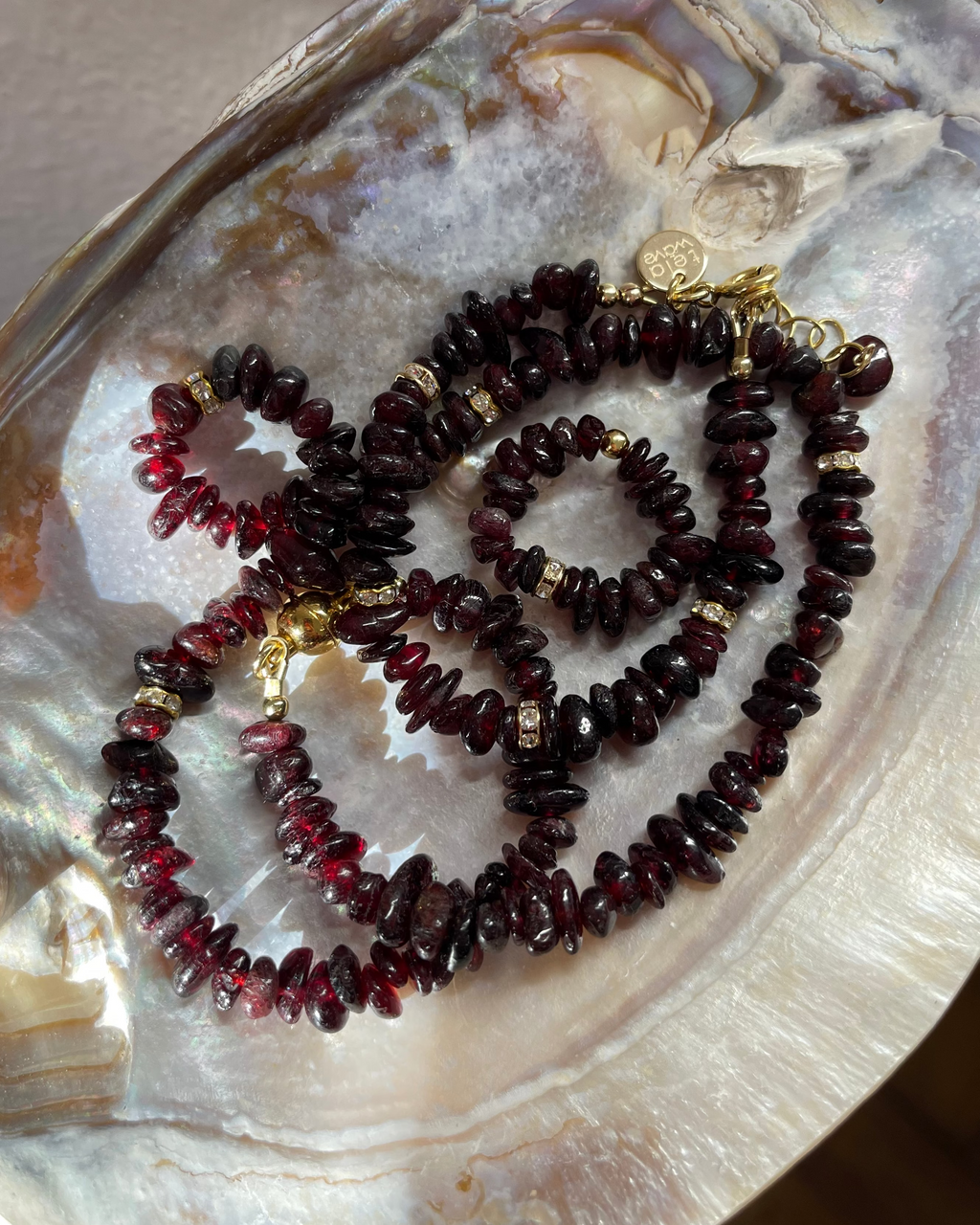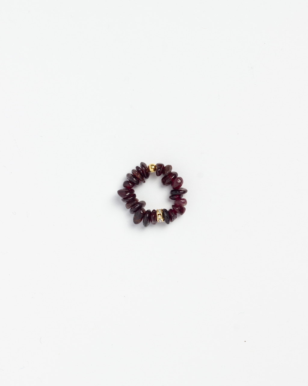 Ring made of crimson Garnet chip beads and a sparkling crystal rondelle
